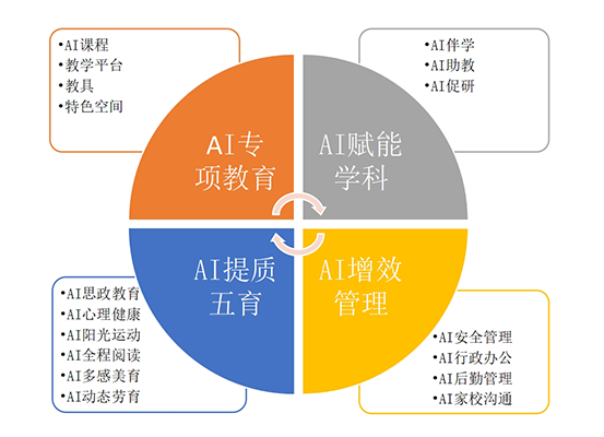 以“教育为魂,人智共生”为理念,育灵童从中小学办学的实际特点和内在需求出发,整合AI最新技术和行业应用产品,提出了一个涵盖四个层次、十五个典型场景的AI教育与AI应用解决方案。具体内容如下: