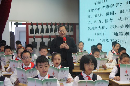 杭州师范大学教授、全国著名特级教师王崧舟首先为与会代表带来了示范课《庄子•天籁》。本课课文对学生来说在理解上存在一定的难度,但经过王教授的点拨,孩子们逐步理解了《天籁》中所包含的庄子思想及其深邃高妙的旨趣。之后,王教授又进行了题为《中国灵魂•诗意构建》的专题讲座。在讲座中,王崧舟校长向与会代表分享了杭州市拱宸桥小学在国学经典教育方面积累的丰富经验。同时,他对优秀传统文化教育的推广以及全社会国学文化氛围的营造,表达了殷切的希望。
